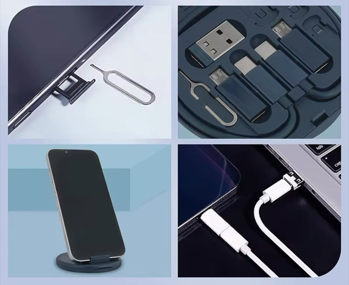 El CABLE DE DATOS MULTIFUNCIONAL 7EN1 no es solo un cable, sino que también viene con un estuche de almacenamiento inteligente. Este estuche incluye ranuras para tarjetas SIM y una herramienta de expulsión, lo que facilita el cambio y almacenamiento de tus tarjetas SIM cuando viajas. Además, el estuche también funciona como soporte para tu celular, haciendo que sea aún más versátil y práctico.